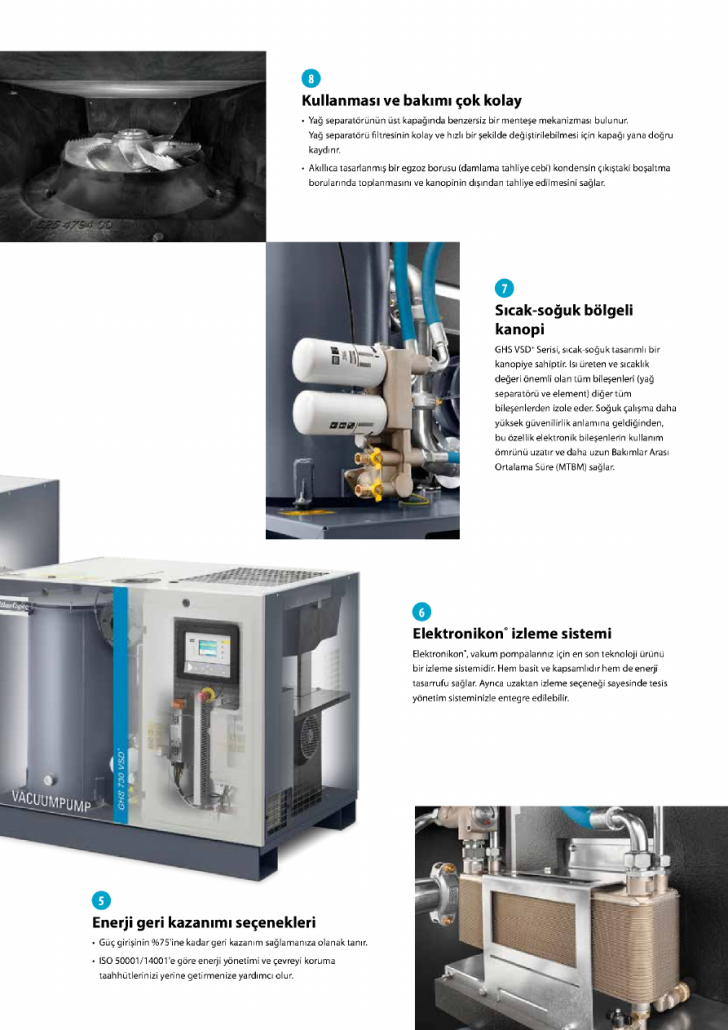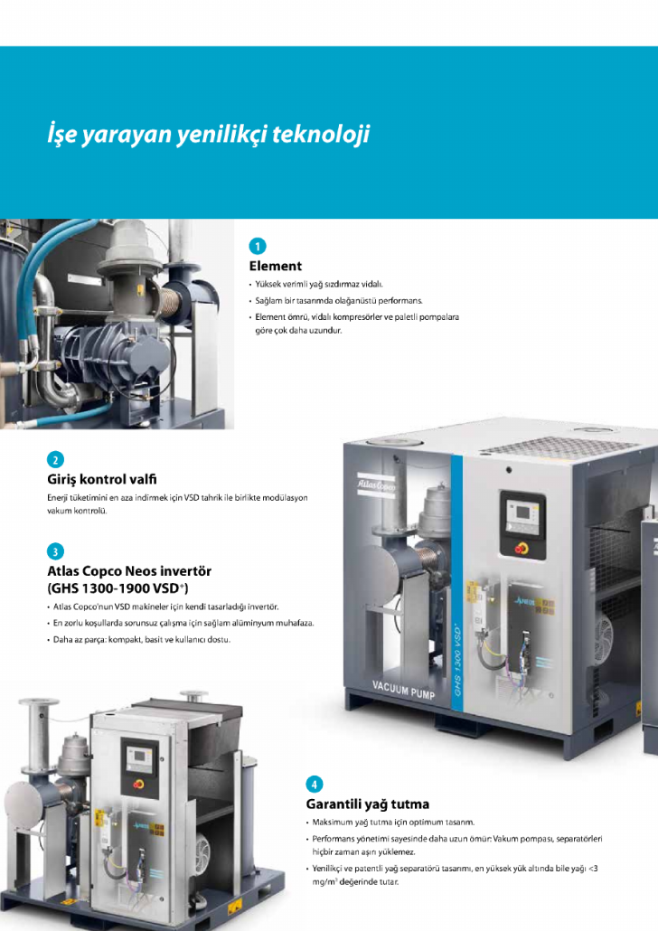 GHS VSD+ Serisi, değişken Hızlı Ünite (VSD) teknolojisine sahip yeni nesil, akıllı, yağlı vidalı vakum pompaları serisidir. Atlas Copco kompresörlerinin tak ve çalıştır tasarım prensiplerine dayanan iyi bilinen ve uzun ömürlü vakum pompaları vakum mühendisleri tarafından vakum çalışma basıncınızda en yüksek performansı sağlayacak şekilde tasarlanmıştır.